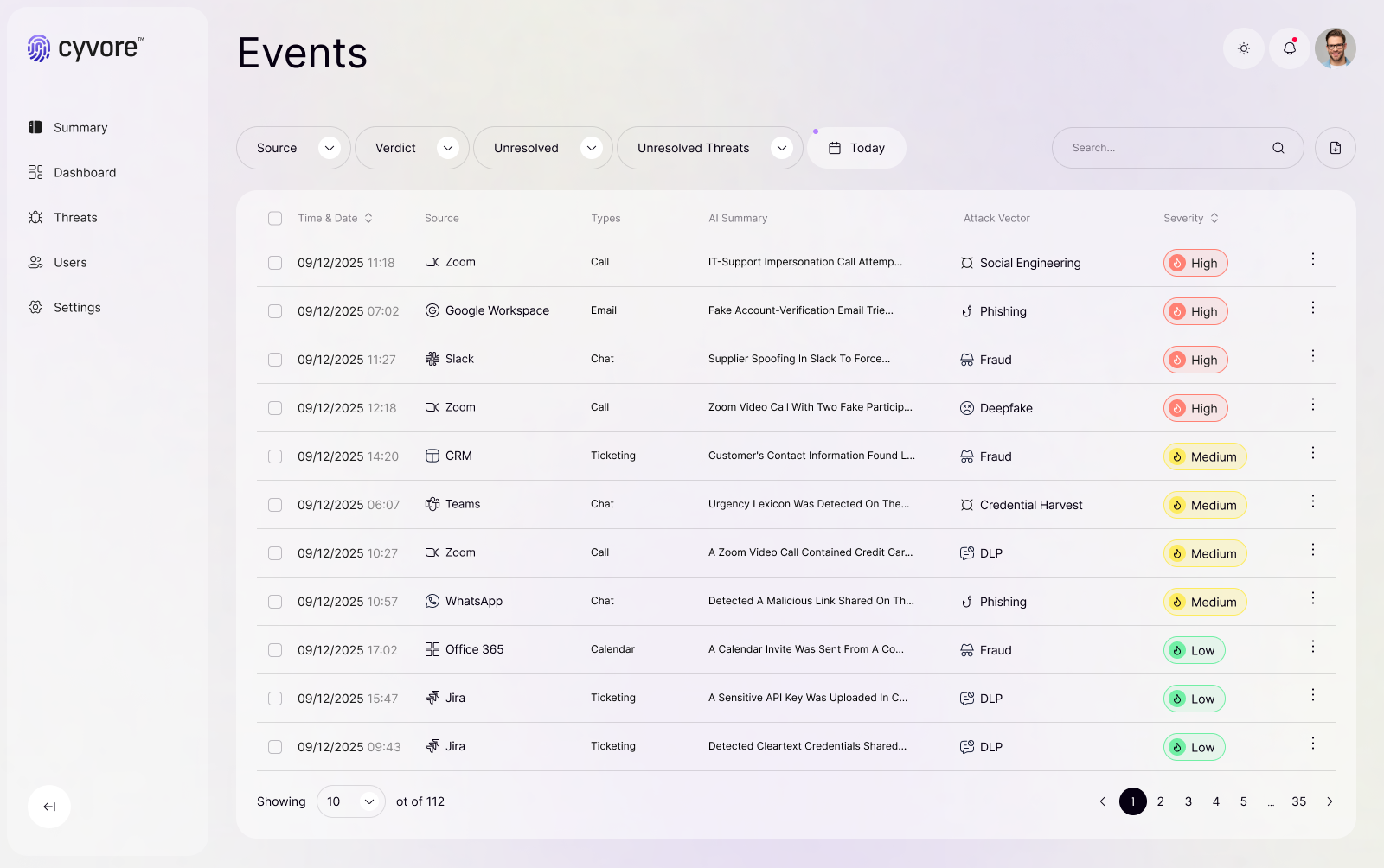 Cyvore combines cutting-edge AI, machine learning, and behavioral analytics to detect, investigate, and neutralize threats before they compromise your organization.